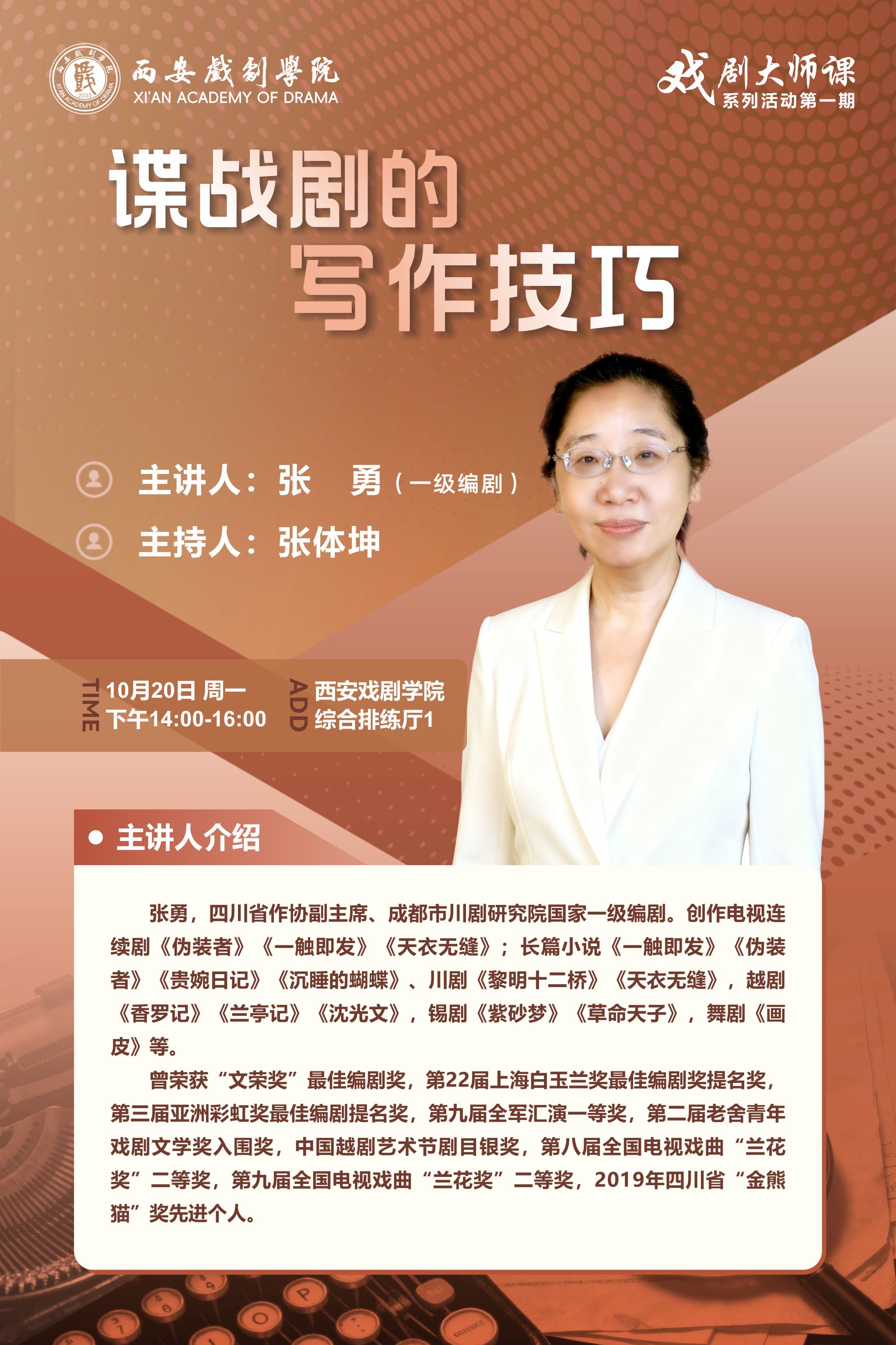 本次讲座主题为“谍战剧写作技巧”,张勇老师将结合自身创作经验,分享谍战剧的叙事方法与写作实践。课程内容涵盖编剧创作的核心环节,适用于不同专业背景的师生学习交流。
