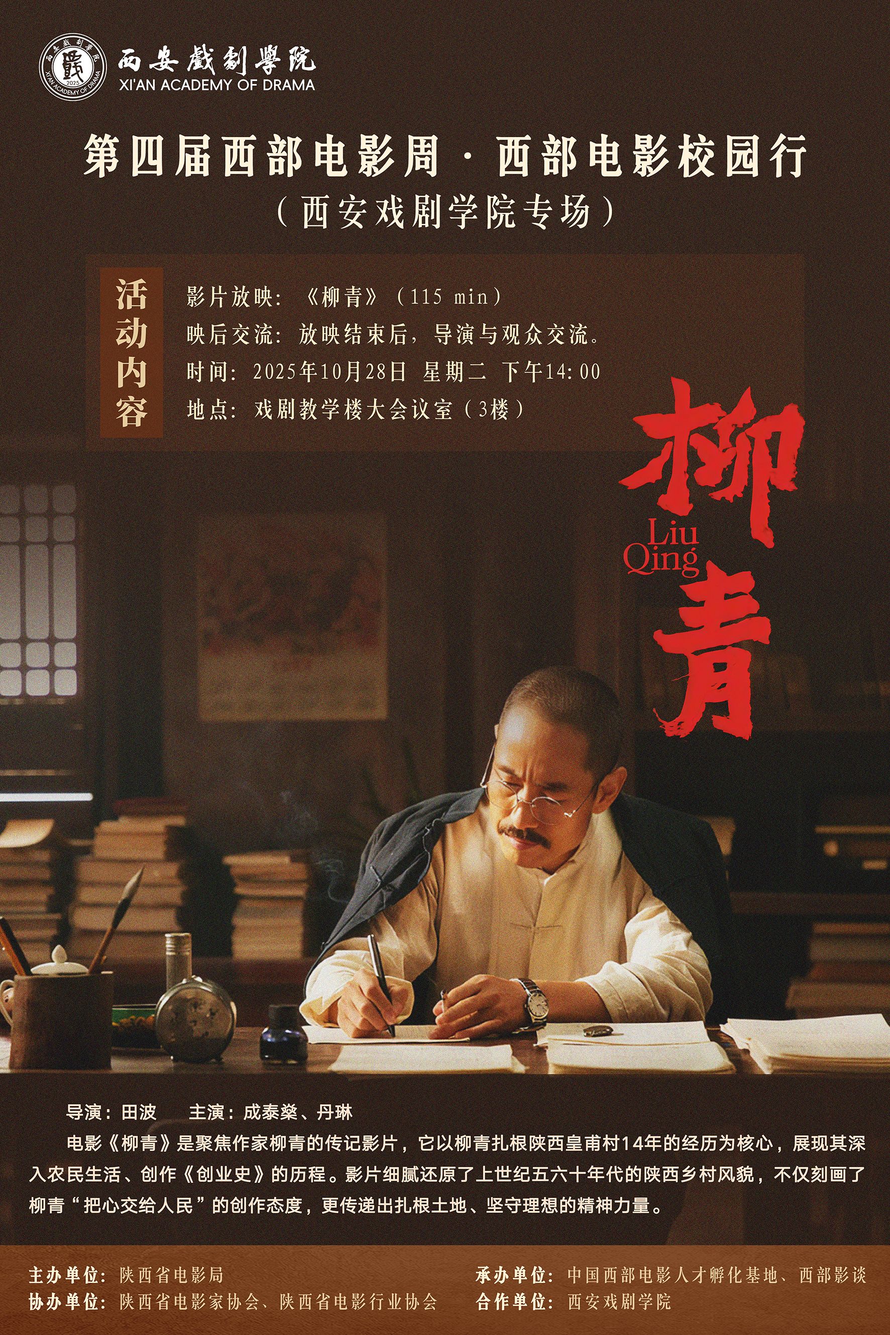 本次活动将于10月28日(周二)下午14:00,在戏剧教学楼三楼大会议室举行,届时将放映人物传记电影《柳青》。影片以细腻的镜头语言和真挚的情感表达,生动再现了作家柳青深入生活、扎根人民的创作历程与精神世界。